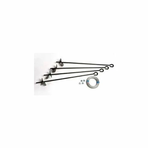 Easy to install. Includes four 30 heavy duty steel augers, 60′ of aircraft strength cable, and 4 cable clamps. Force of 1500 lbs. required to remove anchors from ground. May be used with any suggested base. No digging or concrete pouring required. Insert cables under roof. Feed cable over roof beams. Attach cable to clamps. Twist augers into ground.