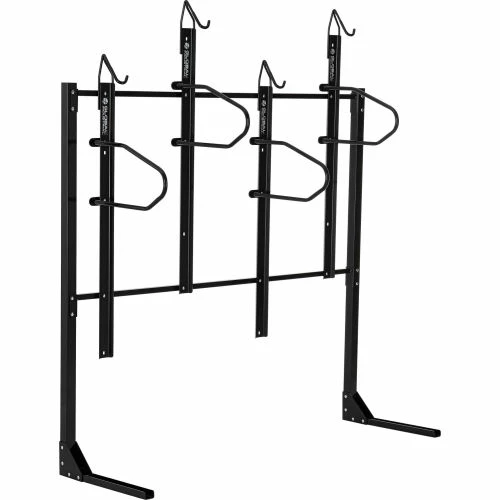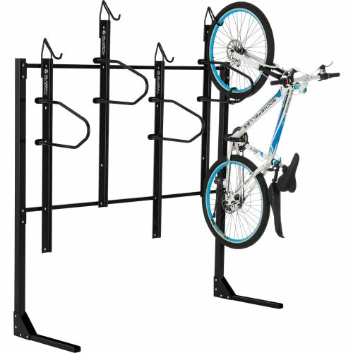 The lockable bike rack set you need to save space is here. The Global Industrial™ Indoor Vertical Bike Rack with 4 Lockable Mounts is designed to keep your bikes in a safe, locked, and secured upright position. Whether it’s an apartment complex or an indoor cycling stadium, this bike rack comes with all you need for convenient and safe indoor bike storage. The indoor bike rack requires 7′ ceiling height and features a staggered design that minimizes handlebar interference. Anchor bolts not included. 1 Year Limited Warranty. Rack dimensions are: 72″W x 45″D x 84″H. Individual mount dimensions are: 4-7/8″ W x 20-1/3″ D x 53-1/7″ H.