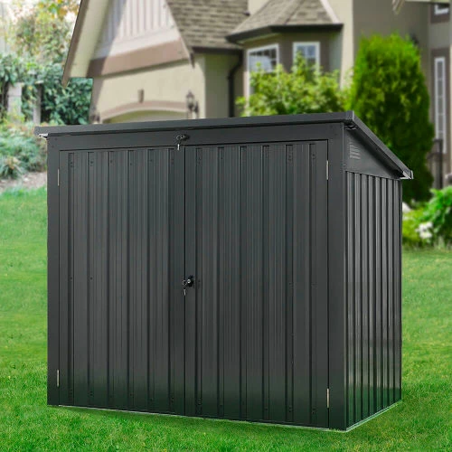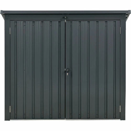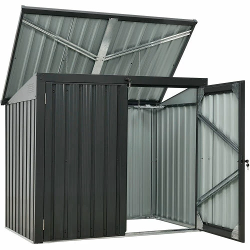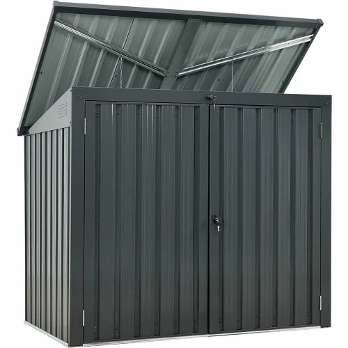 Keep outdoor pests out of the garbage with Hanover’s backyard trash and recyclables storage shed. Constructed from galvanized steel, this strong, durable shed is resistant to rust, corrosion, and UV rays for year-round use. Plus, two top side vents provide plenty of air circulation to keep odors at bay. This unit accommodates up to two 63-gallon trash/recycle bins no taller than 42 inches. Front double-doors open fully to allow easy access and are secured with a lock and key. The hinged pent roof allows quick water runoff during rainstorms as well as top access with a lock and key. For all your outdoor storage needs, depend on quality products from Hanover. Strong and Durable: Storage unit is made of galvanized steel built to last outside year round – rust, rot, mildew, fire, and water resistant. Foundation Included.