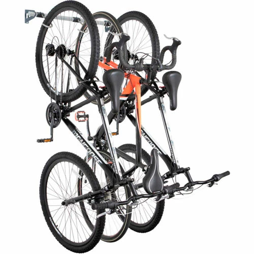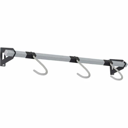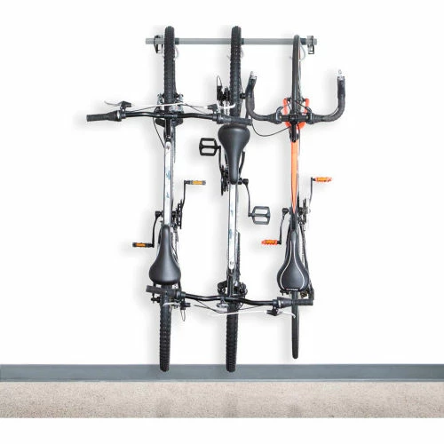 The most versatile bike rack on the market. Monkey Bars have developed a 15 minute installation bike rack that will securely store 3 Mt. Bikes off the garage floor. Only 4 screws into 2 studs 32″ apart and you’re finished. This gives you the versatility to store bikes used less often off the ground and clear up valuable floor space. This rack does not limit you on the size of bike, store kids bikes, road bikes and adult Mt. bikes. Each rack will hold 200 lbs. Kit includes 2-shed brackets, 1-35″ Monkey Bar, 3- J hooks, 4- 2″ wood screws, 4- washers, installation instructions. Limited Lifetime Warranty.