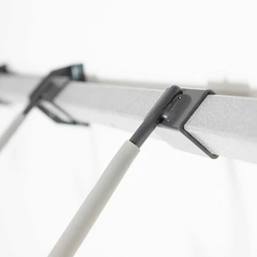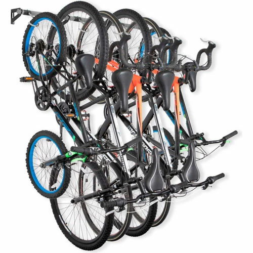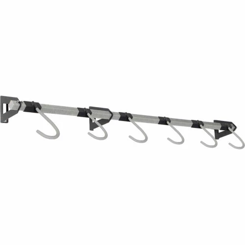 The 6 Bike Rack by Monkey Bars securely stores 6 bikes in a compact space. The 6 Bike Rack’s ability to store 6 adult mountain bikes is designed for long term storage, freeing up valuable floor space in your garage. For daily use, it is recommended to store up to 4 bikes, making it easier to get the bikes on and off the rack. The rack is constructed of industrial steel with a gray powdercoat finish built to endure years of heavy use. The large hooks snap and slide along the bar allowing you to choose where to place the bikes along the rack. Hooks accommodate wheels up to 4″W and have a soft rubber coating to prevent scratches on your bikes. The rack is 48″ wide allowing you to drill the brackets into the wall studs. This rack is strong enough to hold up to 300 lbs. Get your bikes up off the floor today, giving you more room for your cars! . Kit includes 3 brackets, 1 – 51″ Monkey Bar, 6- J Hooks, 1 Hardware bag and installation instructions. Limited Lifetime Warranty.