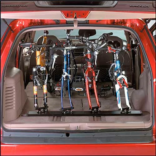Bike carrier track is great for truck bed floors or walls. Made using T6 aluminum with a durable powder coat finish. Rubber pads on bottom secure track into place. Allows anchoring for permanent installation. Includes 3 sets of mounting hardware for Bike Traps. Bike Trap (bike fork mount) and adjustable Wheel Holder are sold separately. Triple Track is designed to fit in larger vans and trucks. Allows you to stagger or angle traps for maximum carrying capacity. 1 Year Limited Warranty.