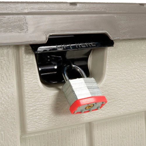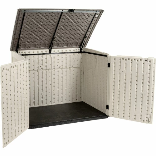 70 cubic Feet; Large enough to hold two 96-gallon garbage containers; Great for storing lawn and garden supplies and tools, smaller bicycles, patio cushions and more; Gas shocks make it easier to lift lid and keep it open; Multi-wall resin panels are engineered for strength and stability; Padlock-ready, 3-door locking system (lock not included); Ramp for easy wheeling in and out; Low-profile design is ideal for placement on the side of a house, patio, or under a fence line